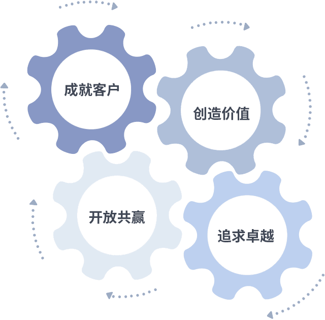 成就客户是一切决策的出发点,,,,创造价值是衡量所有工作的标准,,,追求卓越是我们做事做人的态度,,,开放共赢是我们的格局也是最终的结果。。。价值观的齿轮环环相扣,,推动着组织里的每个人不断向前。。。。
